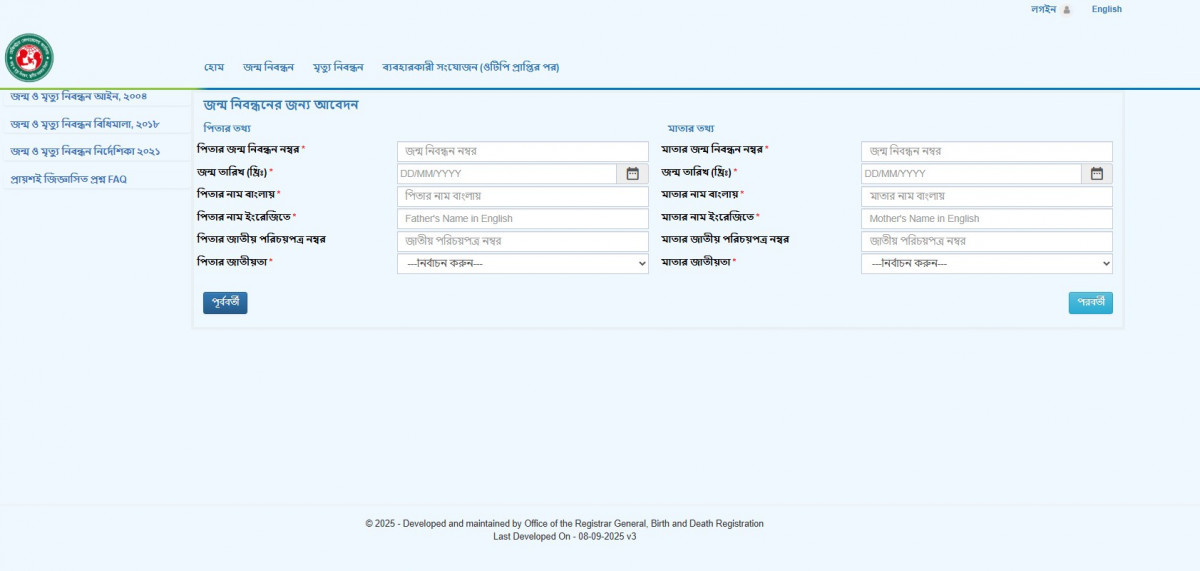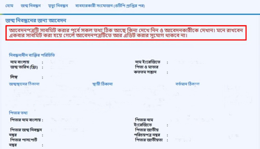 জন্ম নিবন্ধন আবেদনে পিতা মাতার তথ্য পূরন