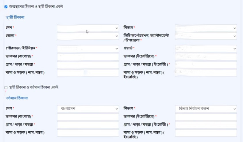 একইভাবে বর্তমান ঠিকানার তথ্যের সাথে যদি স্থায়ী ঠিকানা বা জন্মস্থানের ঠিকানার মিল থাকে, তাহলে ‘স্থায়ী ঠিকানা ও বর্তমান ঠিকানা একই’ -এমন লেখার পাশের বক্সে ক্লিক করবেন।