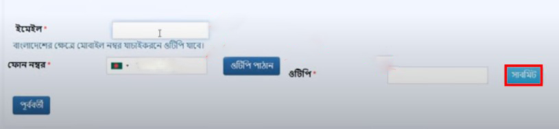 আবেদন রিভিউ পেজের নিচের দিকে গেলে ওটিপি যাচাই করার অপশন পাবেন। এখানে সর্বপ্রথম আবেদনকারীর একটি ইমেইল ঠিকানা লিখবেন। তারপর একটি সচল ফোন নাম্বার লিখে ‘ওটিপি পাঠান’ লেখাতে ক্লিক করবেন। আপনার দেওয়া মোবাইল নাম্বারে ৬ ডিজিটের যেই ওটিপি কোড যাবে, সেটি পাশের ঘরে লিখে সাবমিট করবেন।