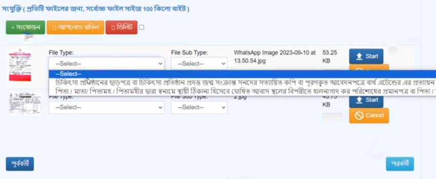 ডকুমেন্ট আপলোড করার জন্য +সংযোজন লেখাতে ক্লিক করে কম্পিউটারের ফাইল থেকে ডকুমেন্টটি সিলেক্ট করবেন। তারপর ‘File type’ সিলেক্ট করে ‘Start’ বাটনে ক্লিক করে আপলোড করবেন।