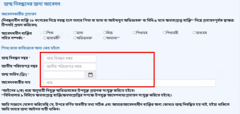 এছাড়া অন্য কেউ আবেদন করলে, নিবন্ধনকারীর সাথে আবেদনকারীর সম্পর্ক, আবেদনকারীর জন্ম নিবন্ধন নম্বর, নাম ও জন্ম তারিখ পূরণ করে দিতে হবে।