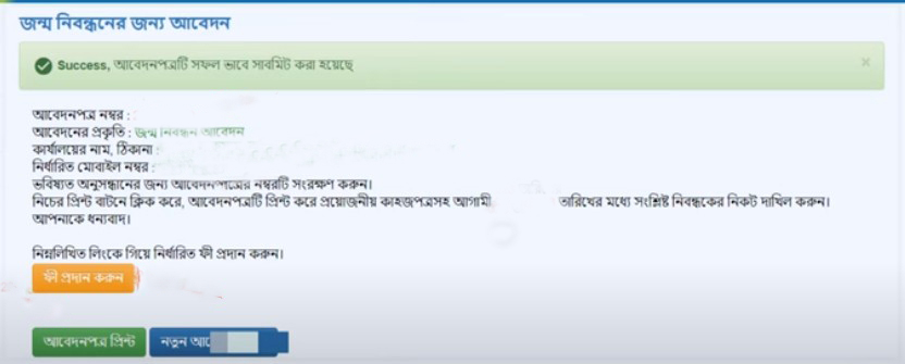 নতুন জন্ম নিবন্ধন আবেদনের সকল ধাপ সম্পন্ন করে সাবমিট করার পর, একটি কনফার্মেশন পেজ আসবে। এখানে আপনার আবেদনপত্র নম্বর বা অ্যাপ্লিকেশন আইডি দেখতে পাবেন। এখানে ‘ফি প্রদান করুন’ অপশনে ক্লিক করে অনলাইনে জন্ম নিবন্ধন ফি দিতে পারবেন।