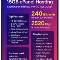 This 15GB cPanel hosting comes with 15 x addon domains, 30 MySQL databases, Softaculous installer, daily backup, a free SSL certificate, and the data center of this cPanel is in Singapore / Australia. We are offering this plan for just 240 taka monthly, which is usually a rate of 300 taka monthly and 2520 taka annually, which is usually 3600 taka annually, for those who need more database-based services.