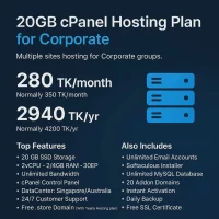 This 20GB cPanel Hosting Plan is perfect for corporate-friendly. It is a multiple-site hosting for corporate groups. We are offering this 20GB cPanel hosting plan for just 280 taka monthly, which is usually a rate of 350 taka monthly and 2940 annually, which is usually 4200 annually. Also, it includes Unlimited email accounts, 20 addon domains, Instant activation, daily backup, a free SSL certificate, and Softaculous installer.