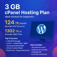 We are offering this 3GB cPanel hosting plan for just 160 taka monthly, which is usually a rate of 200 taka monthly and 1680 annually, which is usually 2400 annually, for WordPress sites to run smoothly. Also, it includes 15 email accounts, a free SSL certificate, and Softaculous installer.