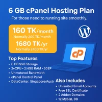 We are offering this 6GB cPanel hosting plan for just 160 taka monthly, which is usually a rate of 200 taka monthly and 1680 annually, which is usually 2400 annually, for WordPress sites to run smoothly and for those who need more database-based services. Also, it includes a free SSL certificate, unlimited email accounts, 2 x addon domains, 12 MySQL databases, and Softaculous installer