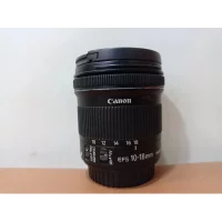This Canon lens features APS-C format compatibility, 10 to 18mm focal length, f/22 to 29 minimum aperture, f/4.5 to 5.6 maximum aperture, 107° 30' to 74° 20' angle of view, 0.15x maximum magnification, 8.66" / 22cm minimum focus distance, 7 rounded diaphragm blades, autofocus, image stabilization, 67mm front filter size, 74.6 x 72mm dimension.