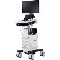This Samsung HS40 Ultrasound Machine with Convex Probe features a fully articulating monitor arm, adjustable operating panel, and additional storage space. It is powered by CrystalLive, offers semi-automated imaging reporting tools for breast assessment, 3D data manipulation, biometry assistance, E-Strain, uterine assistance, and a 5D NT measurement tool.