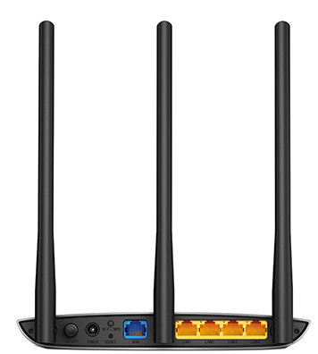 Tp link TL-WR945N wireless N router has 450 Mbps speed, metallic exterior, three omni directional antennas, WPS button, access control, local management, remote management.