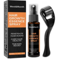 This West & Month's hair growth essence spray contains 30ml of oil liquid with a derma roller. It