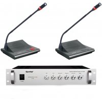 Professional interphone system is known as window intercom or talk back system. The package comes with an electret condenser cardioid microphone, desktop intercom, window intercom option-1, window intercom option-2, and a 2.4-meter cable for window intercom. The microphone of the window intercom's output is 1 REC via a 3.5 mm stereo jack.